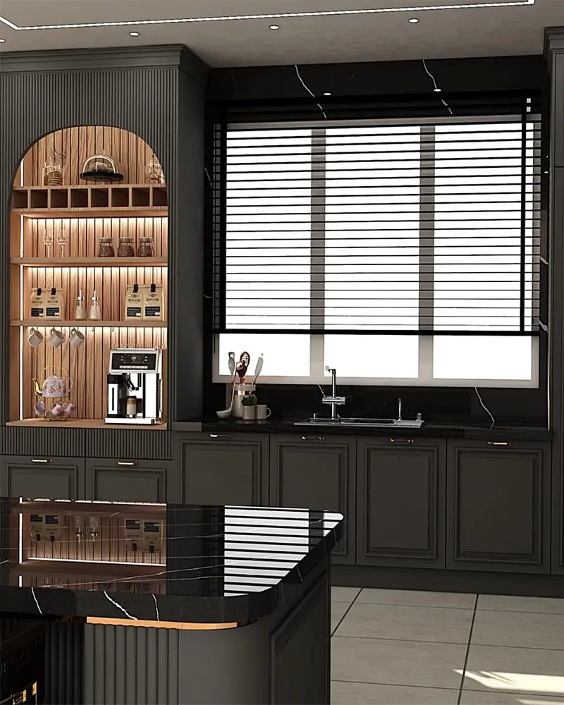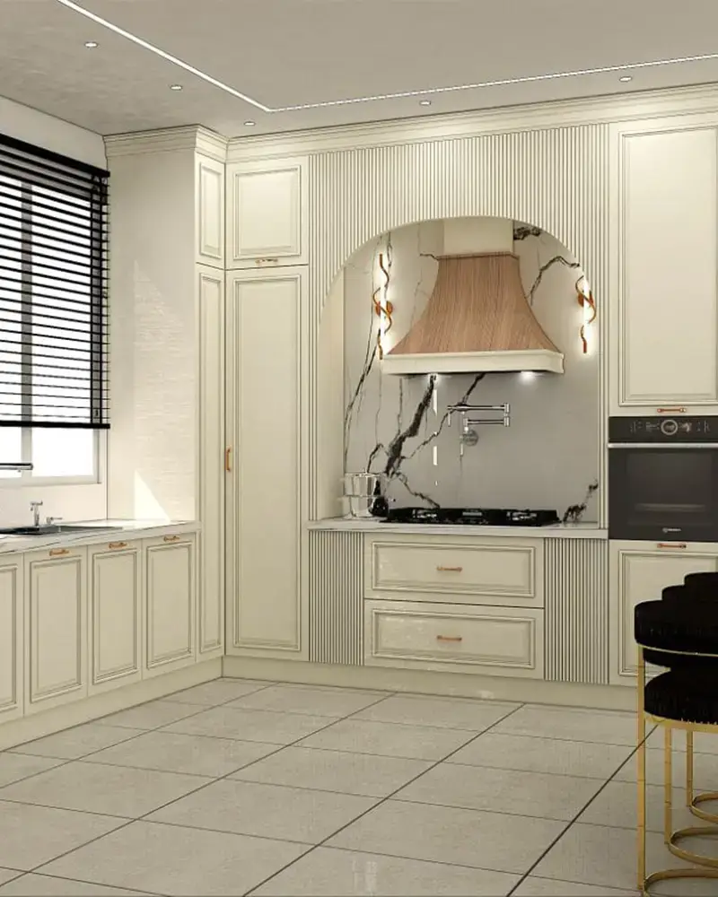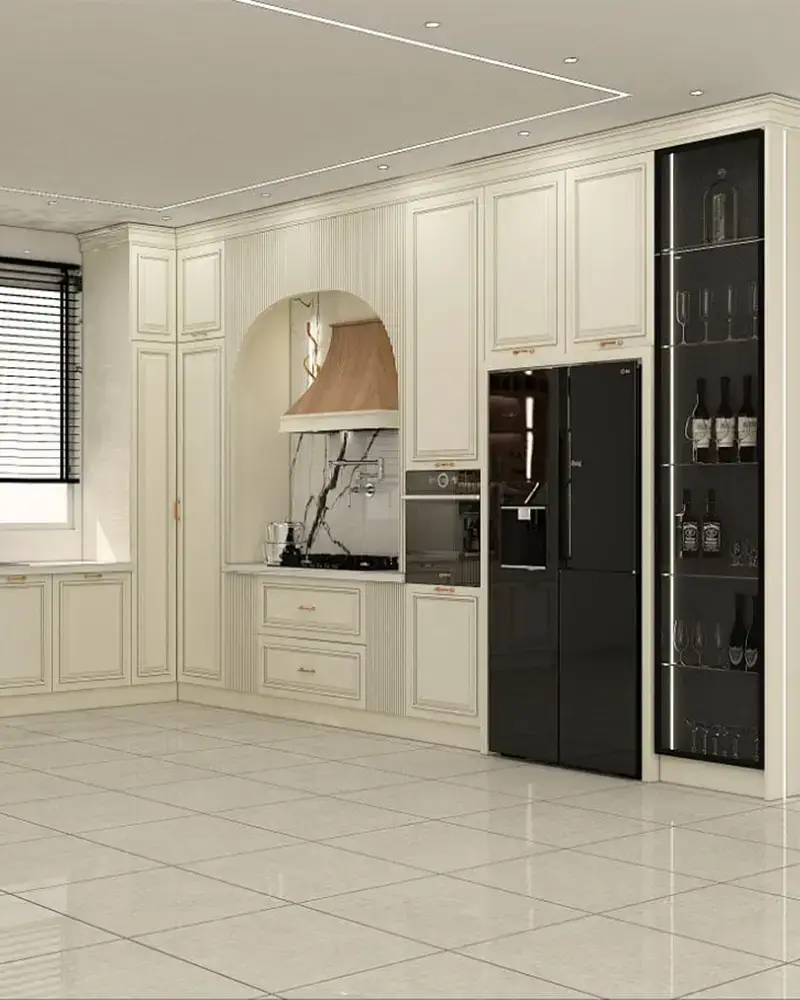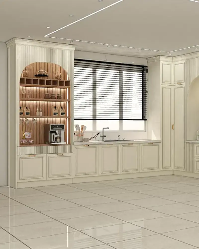 کابینتهای نئوکلاسیک این پروژه با دقت بالا و جزئیات دقیق طراحی و اجرا شدهاند تا علاوه بر زیبایی، کاربری آسان و دوام طولانی را نیز تضمین کنند.