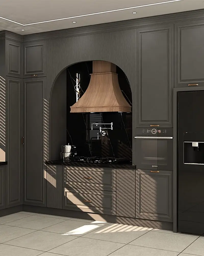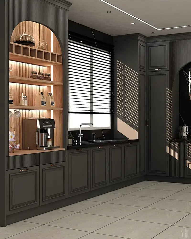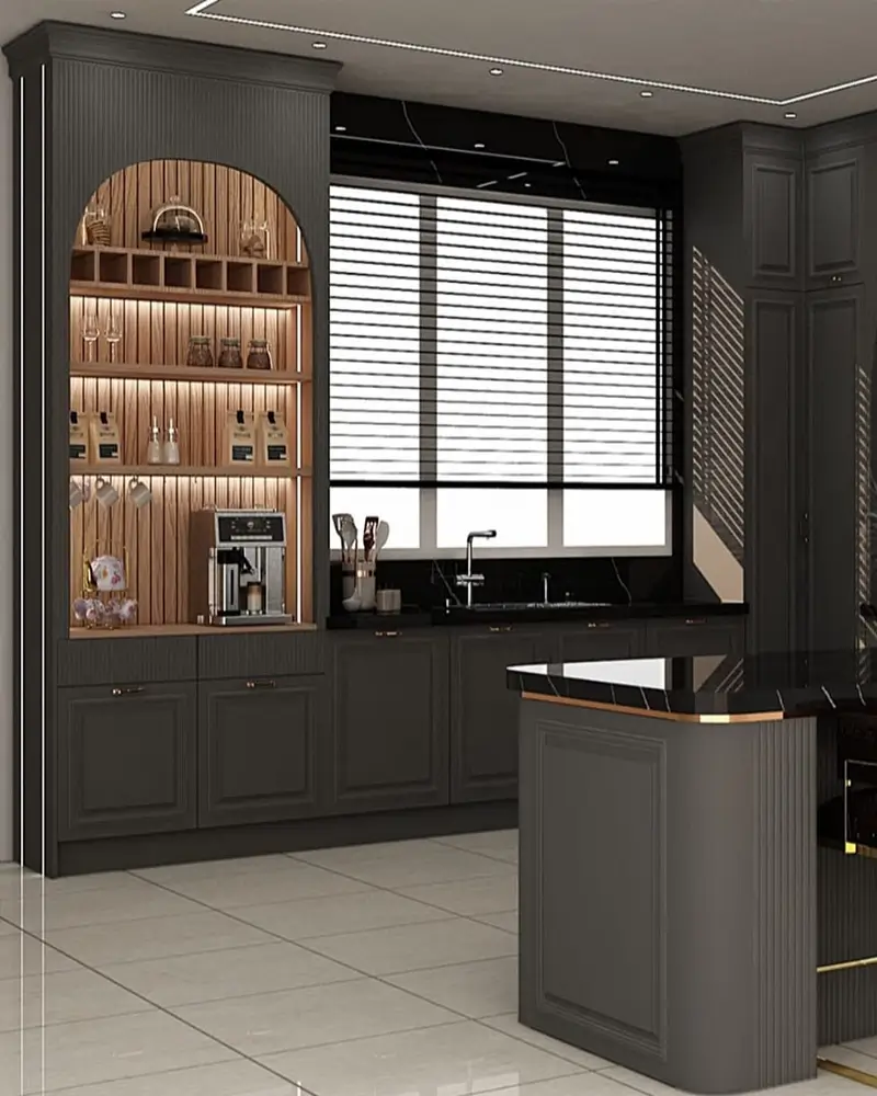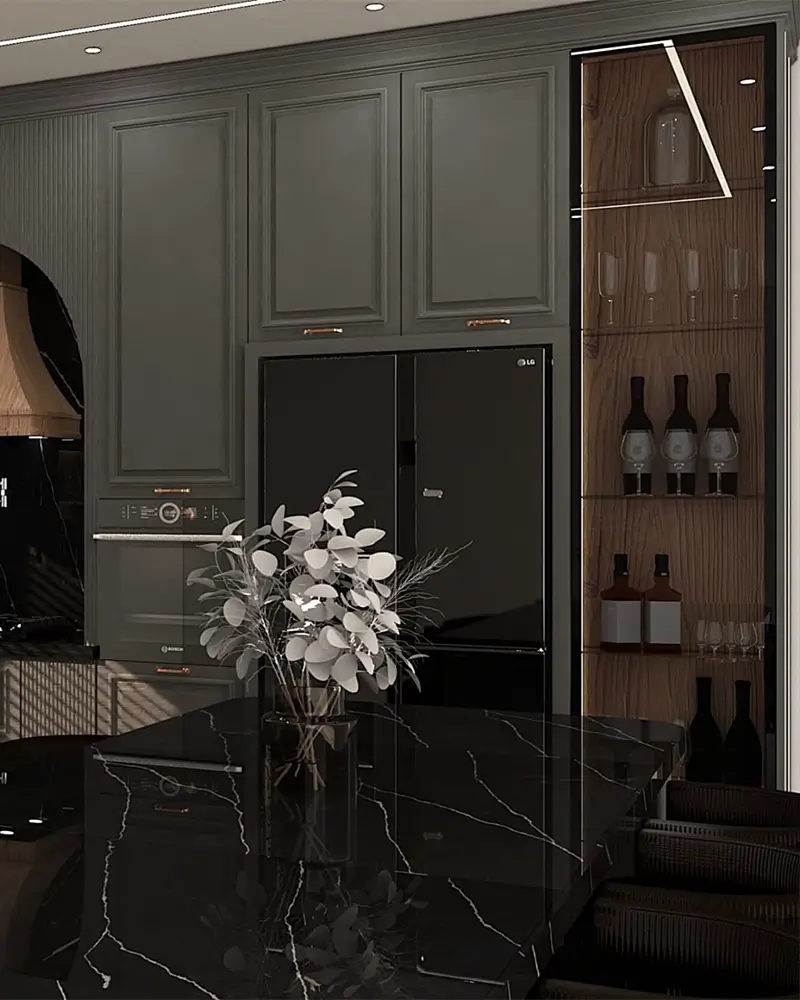 کابینتهای نئوکلاسیک این پروژه با دقت بالا و جزئیات دقیق طراحی و اجرا شدهاند تا علاوه بر زیبایی، کاربری آسان و دوام طولانی را نیز تضمین کنند.